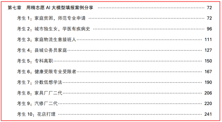 更难得的是,书中收录了10个真实家庭的填报案例,几乎覆盖了所有考生可能遇到的特殊情况:家庭贫困想报考师范院校、有疾病史受限无法学医、厂二代规划接班、专科高职升学、分数偏低却想攻读法学……家长可以直接对照自身情况参考,快速找到最适合自己孩子的填报思路,避免盲目跟风、踩坑出错。